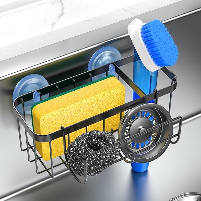 Heavy-Duty Stainless Steel Kitchen Sink Caddy - Suction Cup Sponge Holder & Hooks, Rust-Proof Black