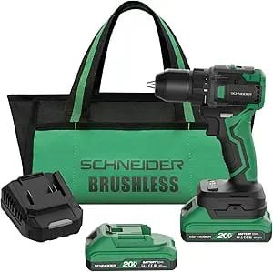 SCHNEIDER 20V MAX Brushless Cordless Drill Driver Kit | 619 in-lbs Torque, 1/2" Chuck, 2 Batteries