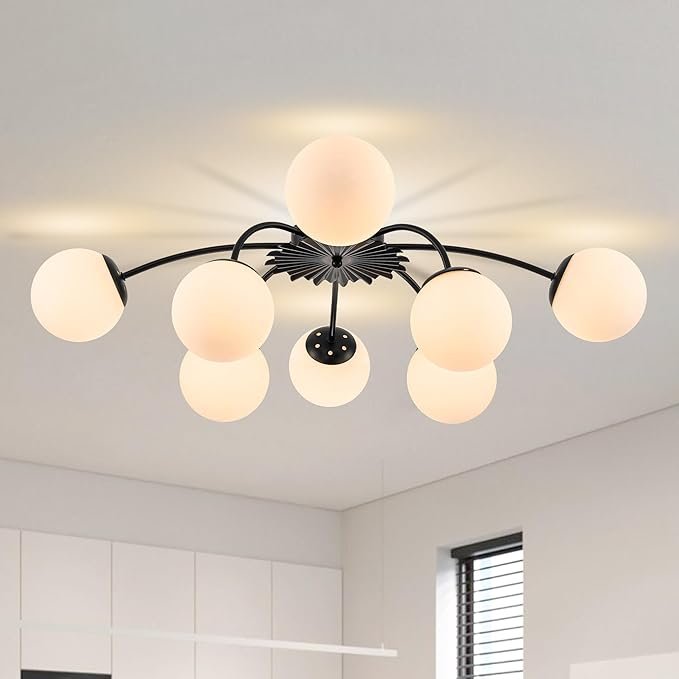 Elevate your home with this stunning 33-inch Sputnik Chandelier. Featuring 8 hand-blown milk glass globes and a sleek matte black finish, this fixture blends Mid-Century Modern aesthetics with contemporary elegance. Whether installed as a semi-flush mount or a focal pendant, it provides soft, diffused lighting perfect for dining areas or living spaces.