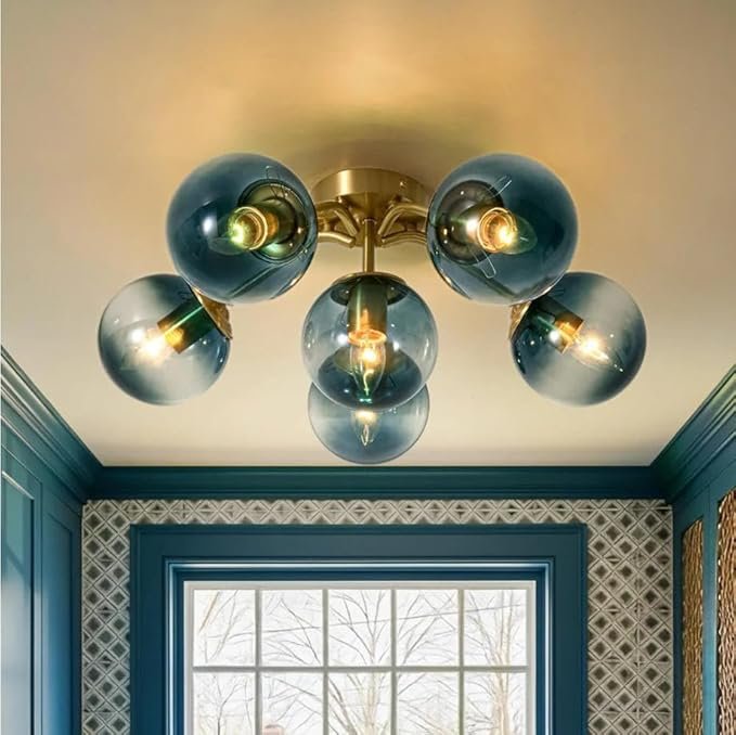 Transform your home into a gallery of modern design with our 6-Light Sputnik Bubble Chandelier. This 22-inch semi-flush mount fixture blends mid-century modern charm with a playful, contemporary twist. Featuring stunning blue glass globes arranged in a dynamic Sputnik silhouette, it serves as both a functional light source and a bold piece of ceiling art.